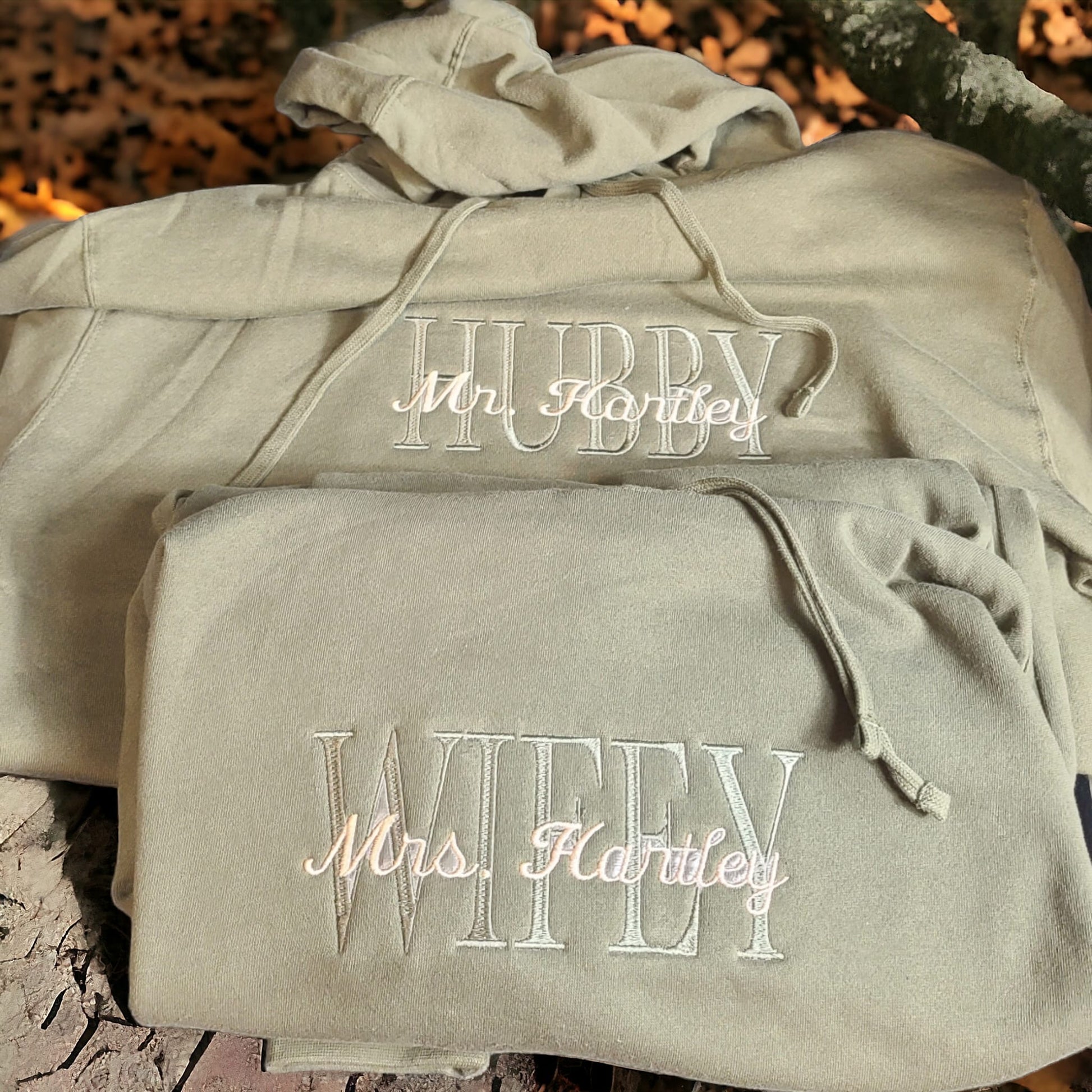 Get cozy in style with our Hubby & Wifey hoodies! These matching embroidered hoodies are the perfect way to show off your love for your significant other. Personalize them with your last names for a special touch. Stay warm and fashionable together!