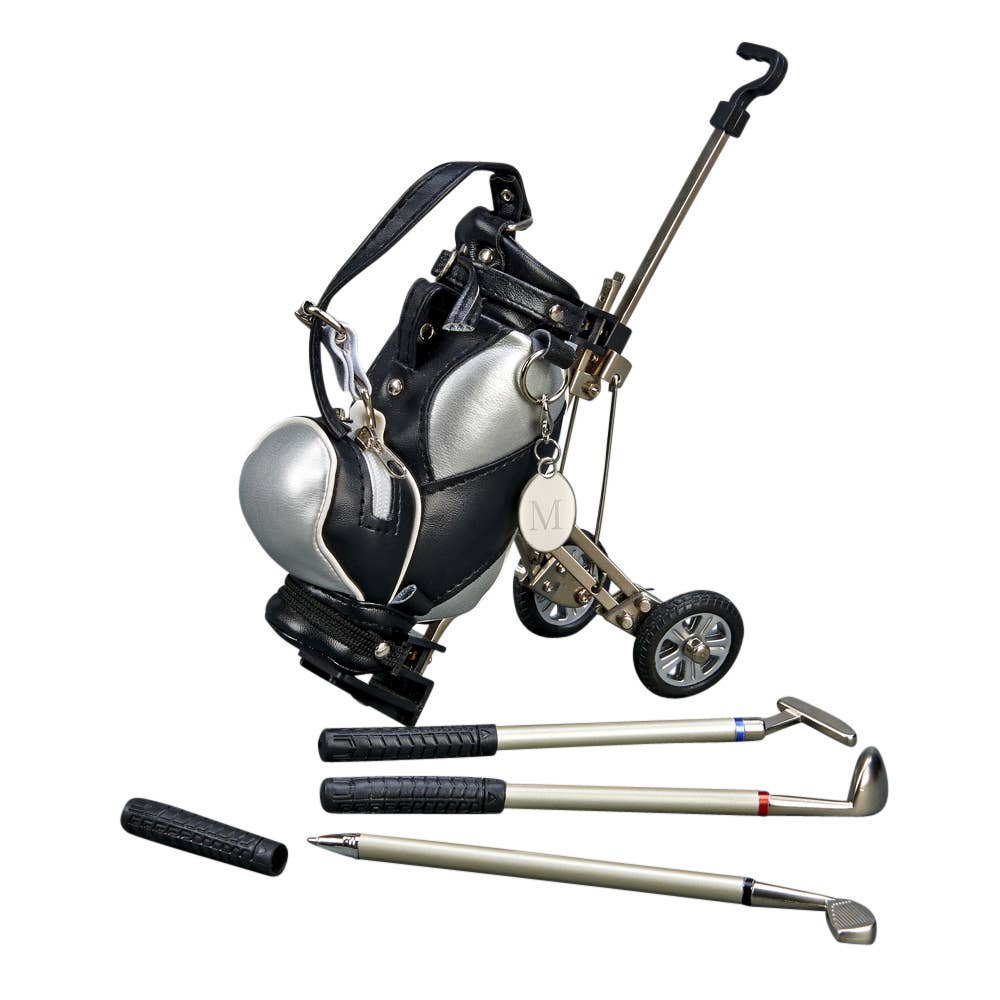 The perfect gift for the dedicated golfer. Our three-piece golf club pen set with a golf bag and cart will make any golfer happy. Remove the grips on the club handles to reveal the hidden pens. Three different club choices - the 6" L driver has red ink, the 5.75" L putter has blue ink and the 5.75" L wedge has black ink. The black and silver golf bag on the cart makes the perfect pen or pencil cup for your desk. The golf bag has two small zippered storage areas, as well as working rubber wheels and a moveable golf cart handle. A clip-on .625" x .875" engraving tag is also included. Non-tarnish brushed silver finish. Gift Boxed.