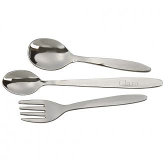 What great gift for the new bundle of joy. This set is finished with a non-tarnish nickel plate. The fork is 1" x 4", the spoon is 1" x 4" and the long handled spoon is 1" x 5.5". Sheridan photo gift box.